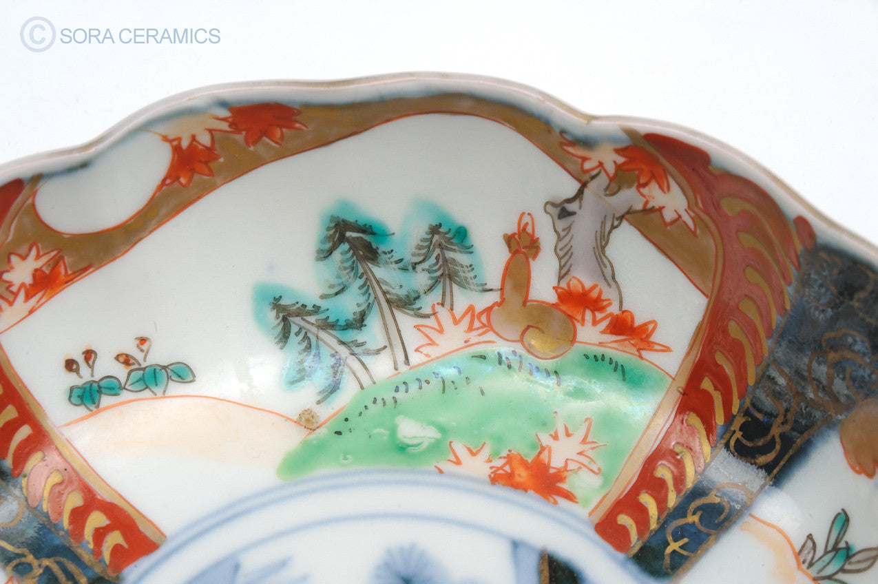 Ko Imari Bowl with finely painted chrysanthemum and deer/moon design. The center holds a tree, a cloud, and a sake jar done in blue and white underglaze. 6-1/8” (20.3 cm) diameter. 2” (5 cm) high. Late Edo period.
