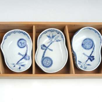 Imari lidded bowls, underglaze-blue with overglaze enamels. Exquisitely painted on exterior in reserves of alternating cobalt and white slylized chrysthanemum, red lantern berry, and white ho-o bird (phoenix) motifs. Ring-banded on inside at top with blue underglaze and white negative space to a blue double-ring band in the center enclosing pale blue dragon. Each lid delicately painted both inside and outside in themes echoing the bowl. Inside the lid finials with characters “Fuki Choshun” (prosperity, long spring). Lids serviceable separately as sauce cups. 4-1/2” (11.4 cm) diameter. 2-1/2” (6.4 cm) high. $150 ea; set of 7, $1150.