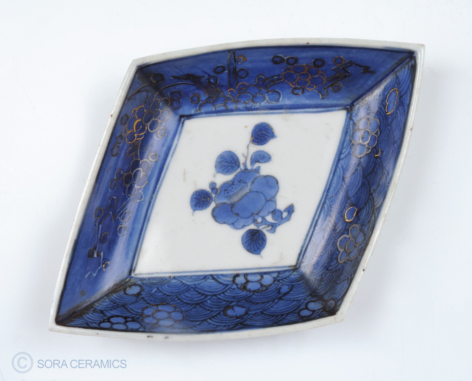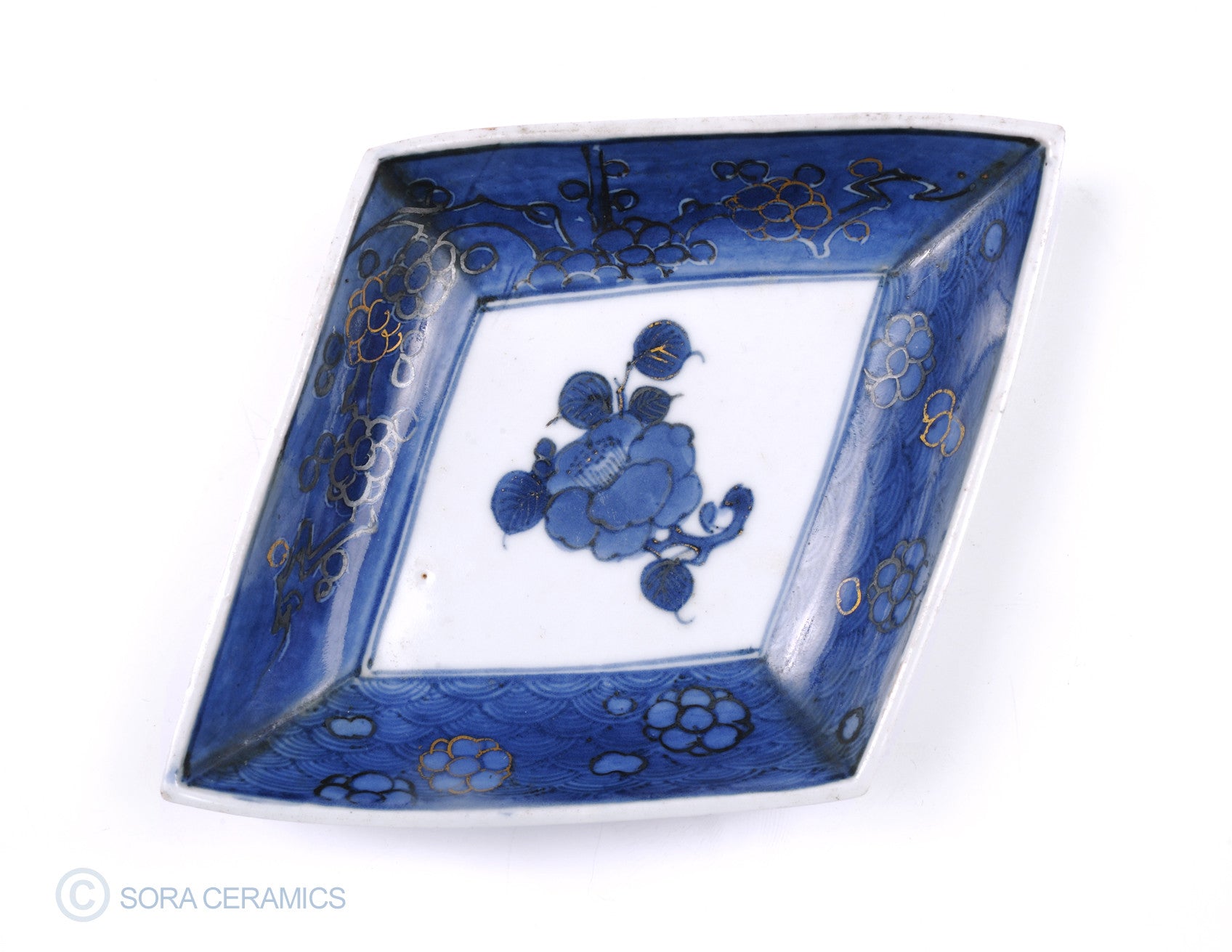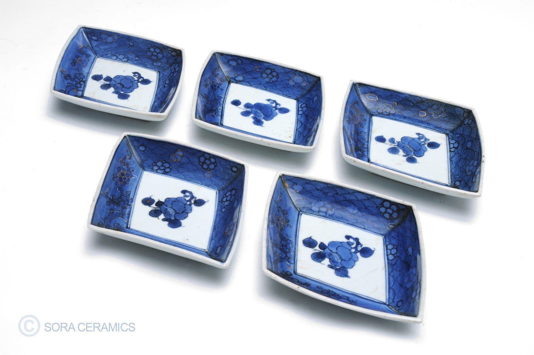 Set of five lozenge-shaped dishes, ko Imari, in underglaze-dark blue (gosu). Very early ko Imari. (see similar item atShibata Collection, Complete Catalog, p.128 no. 0964, attributed 1660-1670). 5” (12.5 cm) x 6-1/2” (16.25 cm) x 1” (2.5 cm). Early Edo period.
