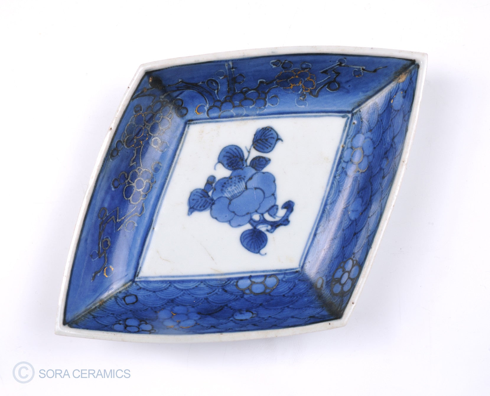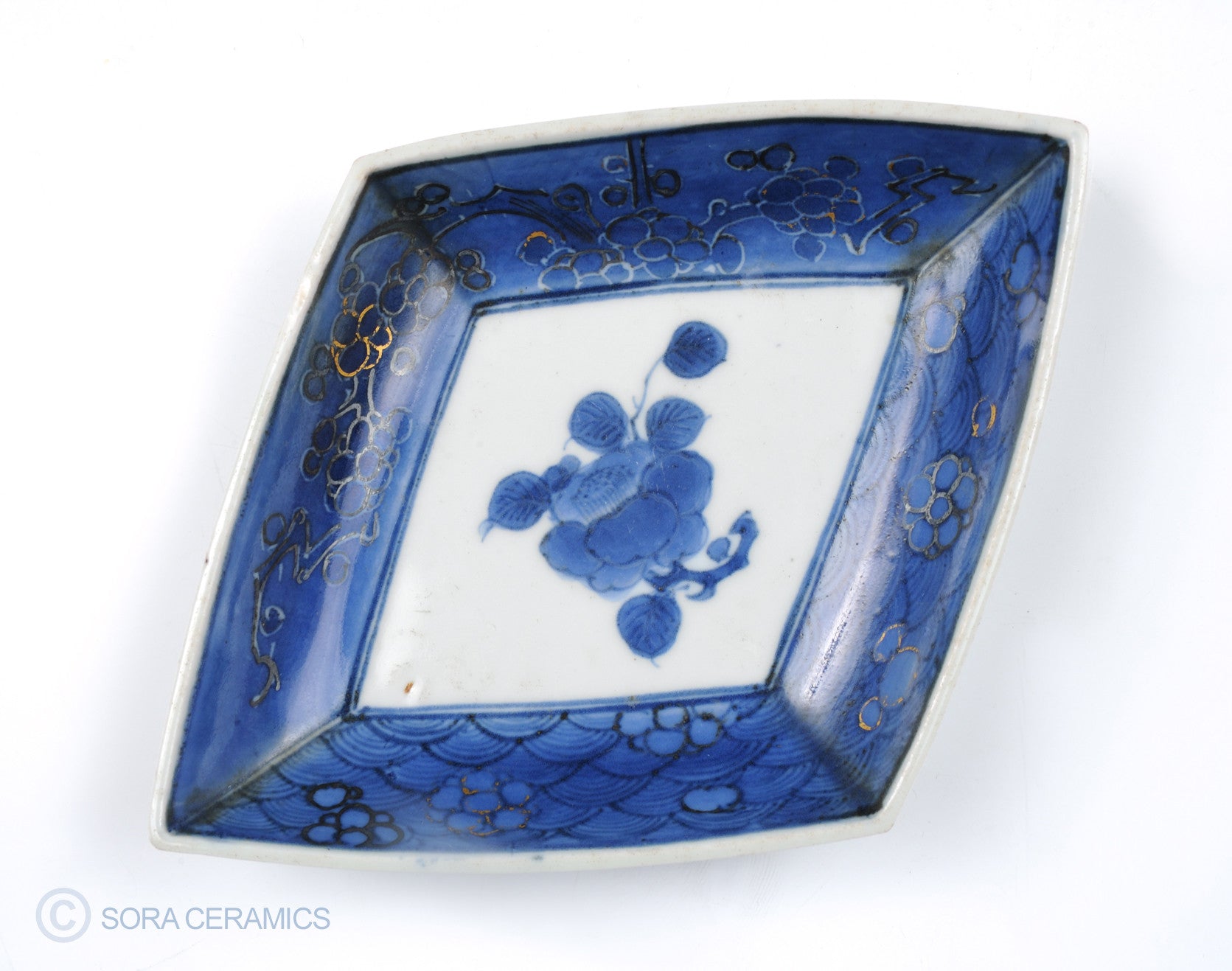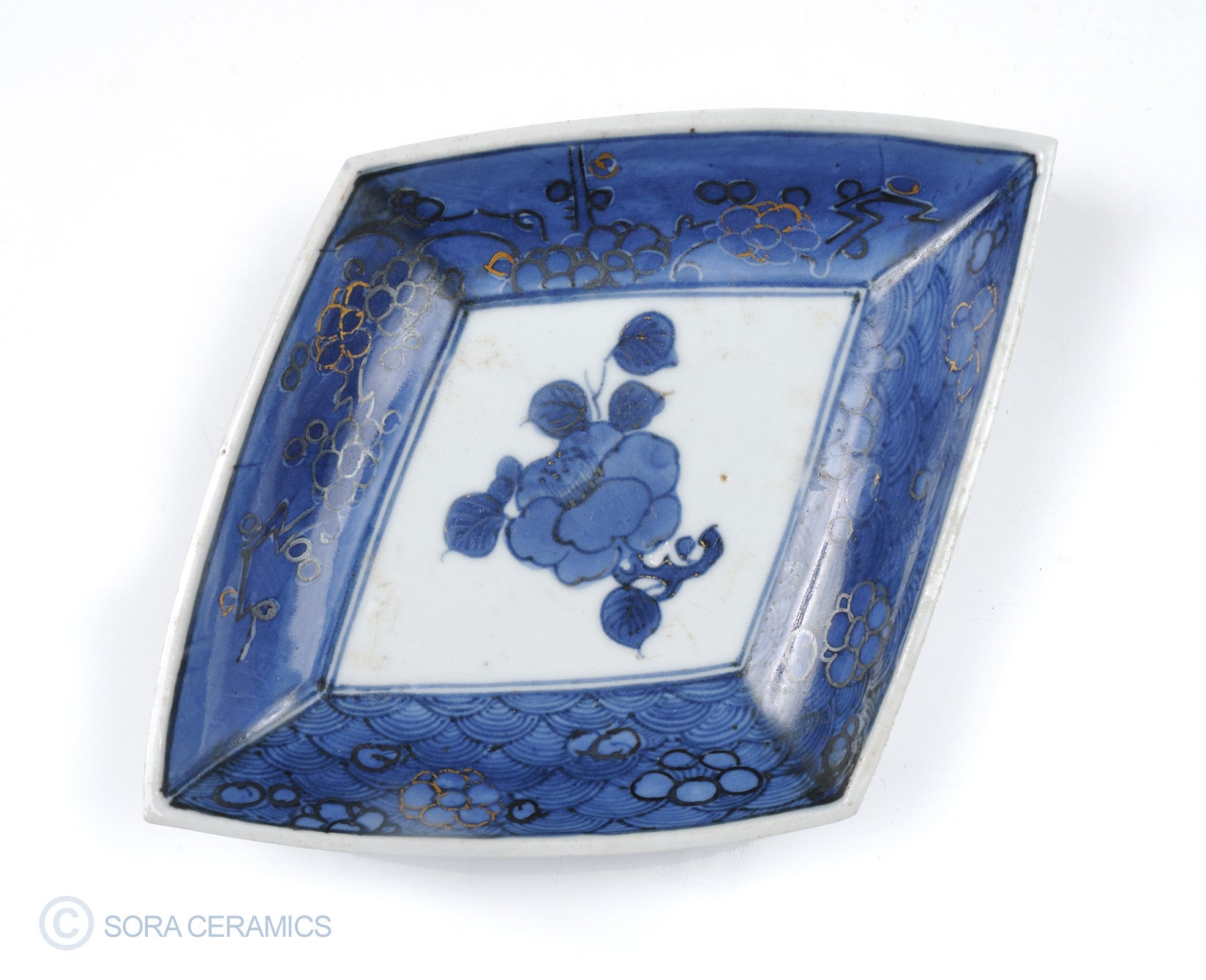 Set of five lozenge-shaped dishes, ko Imari, in underglaze-dark blue (gosu). Very early ko Imari. (see similar item atShibata Collection, Complete Catalog, p.128 no. 0964, attributed 1660-1670). 5” (12.5 cm) x 6-1/2” (16.25 cm) x 1” (2.5 cm). Early Edo period.