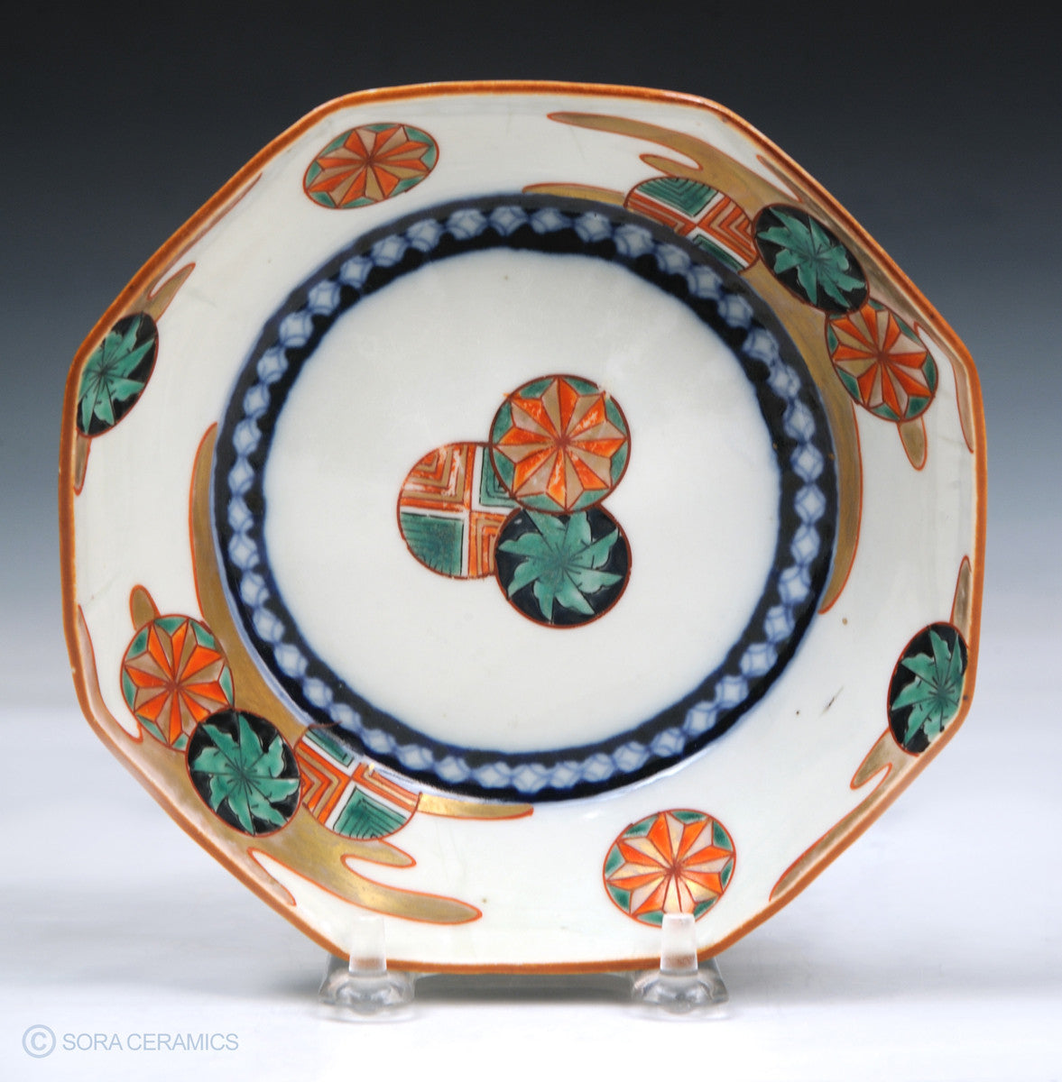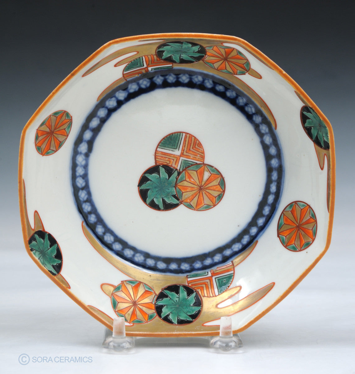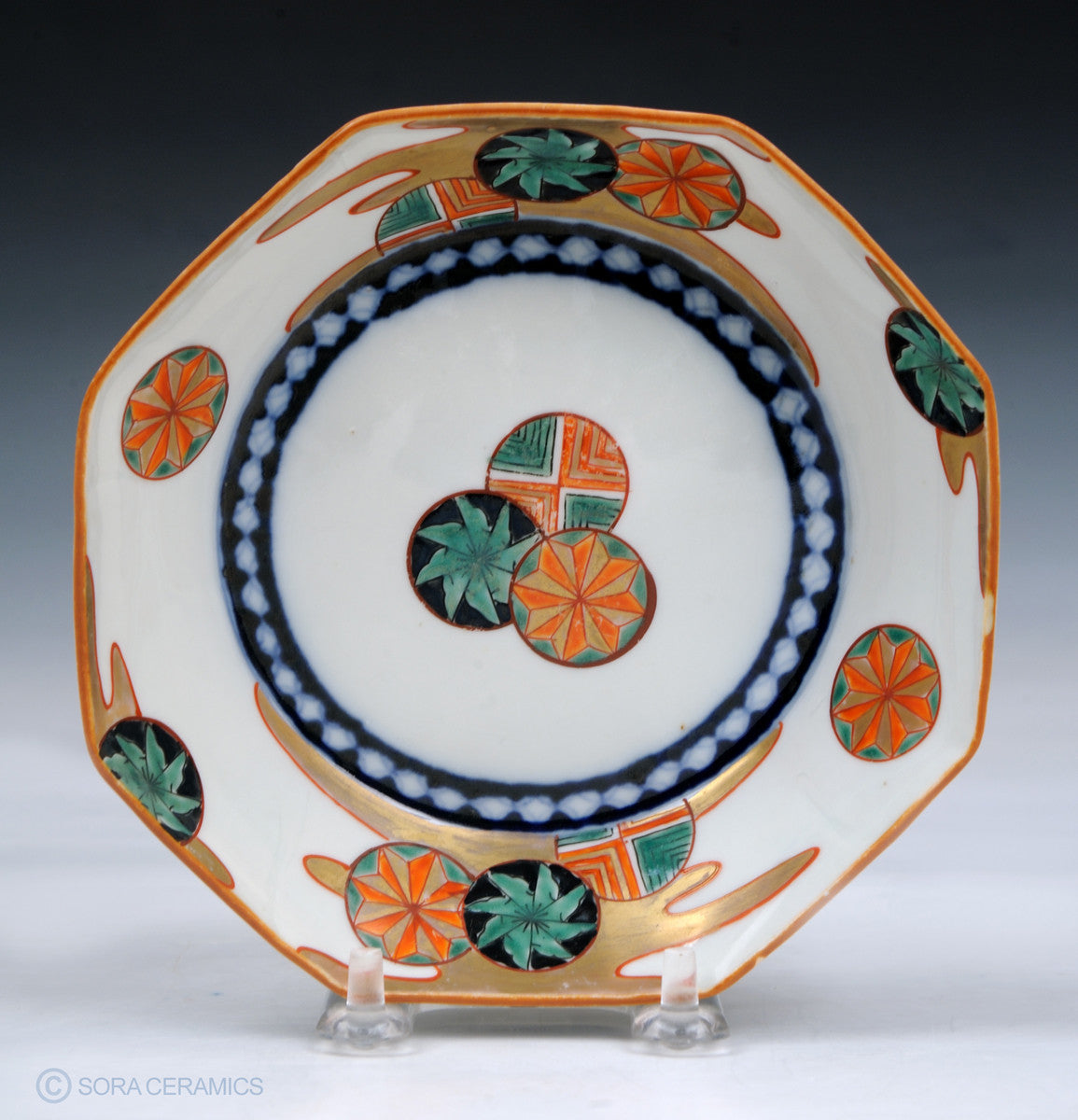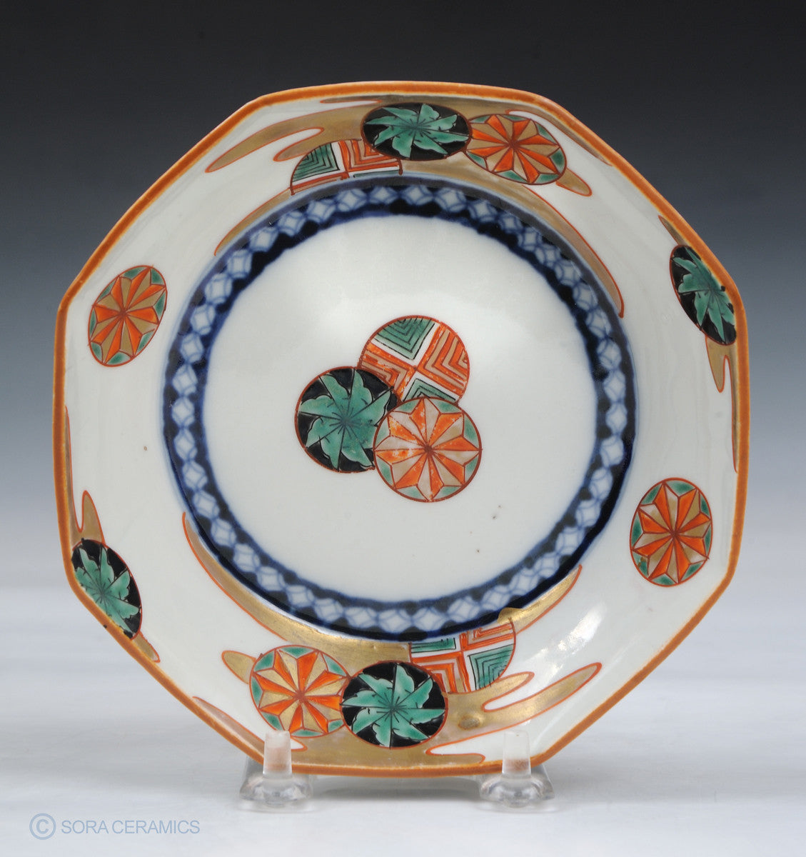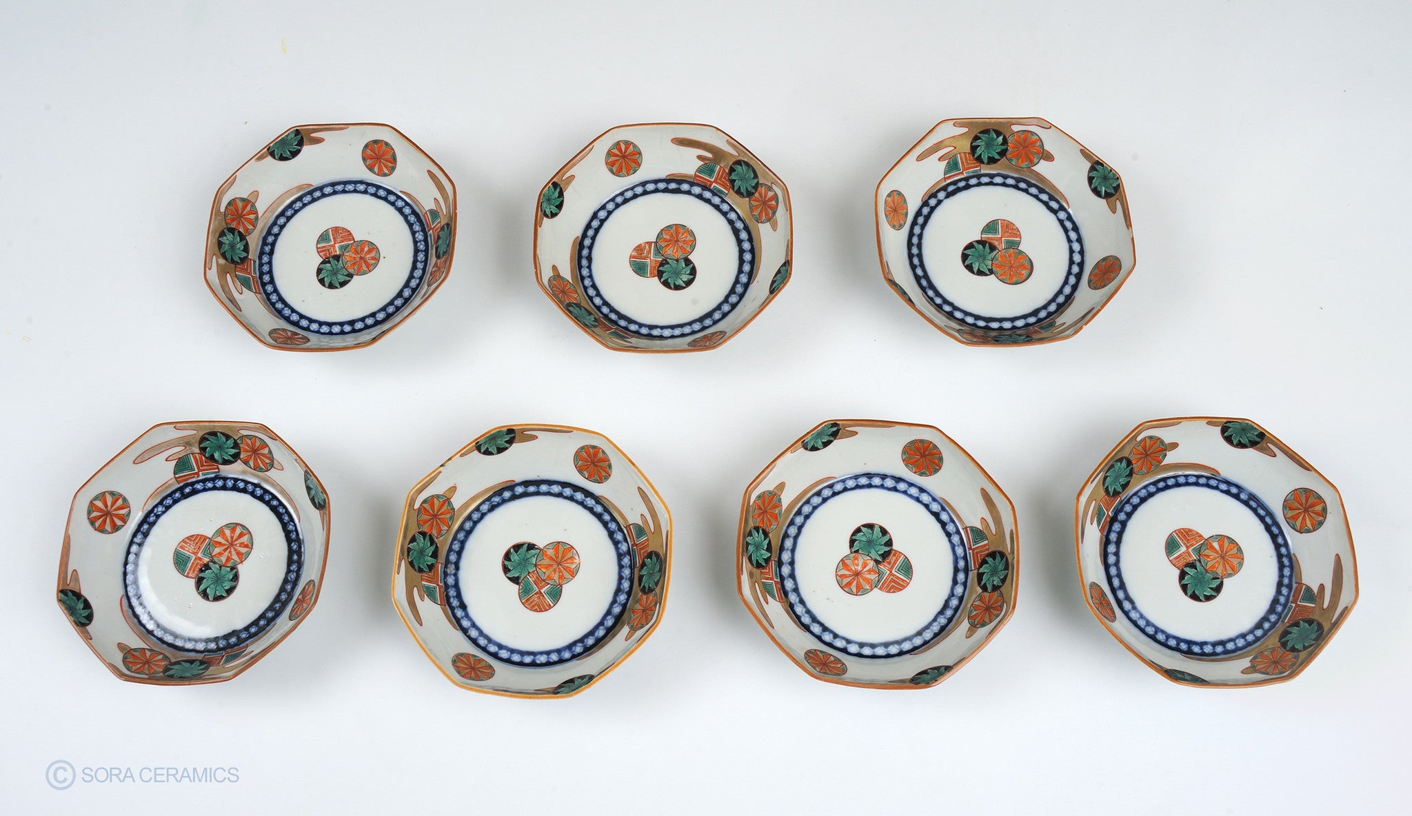 Set of 7 aka-e Imari hexagonal small dishes with underglazed blue border at base of interior white space encircling three coin-shaped geometric designs in right gold and autumn tones, repeated along the rim. Clusters of leaves and a karakusa vine encircle the exterior. 5-7/8″ (5.875 cm) diameter, 1-3/4″ (4.37 cm) high on a triple-ringed plain base 3-1/4″ (8.125 cm) diameter plain base. Priced individually@ $90 or set of 7 @ $575.