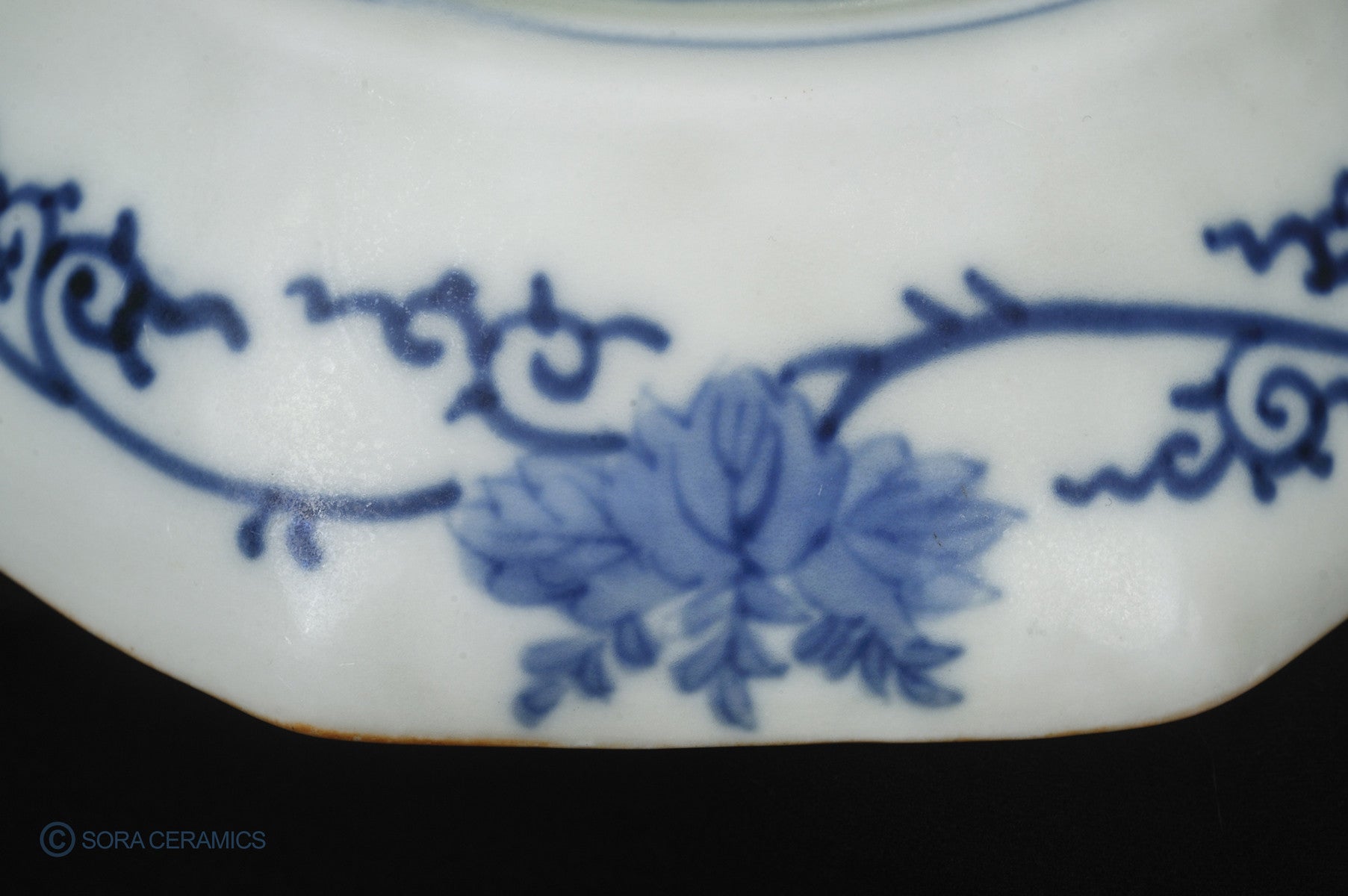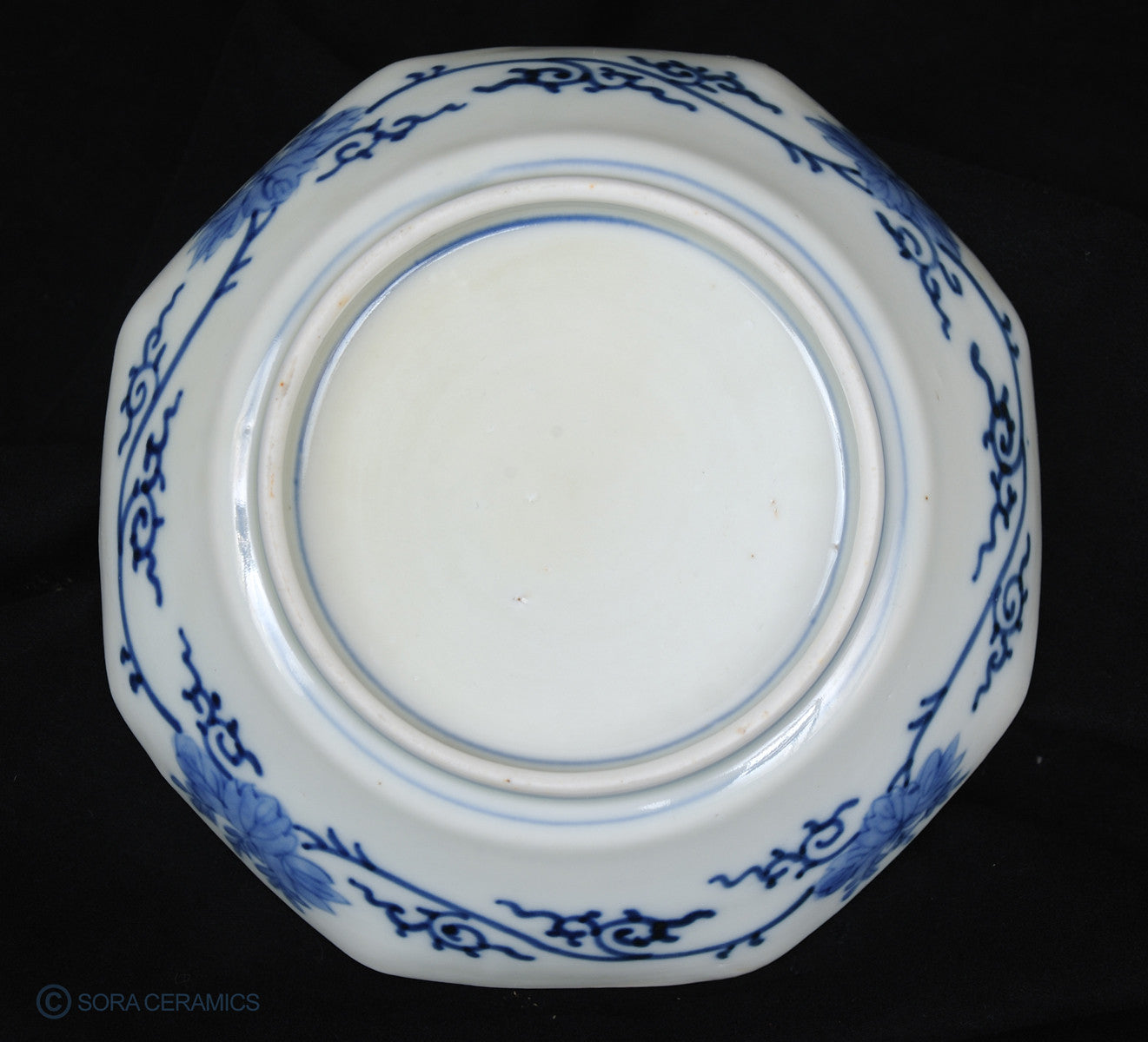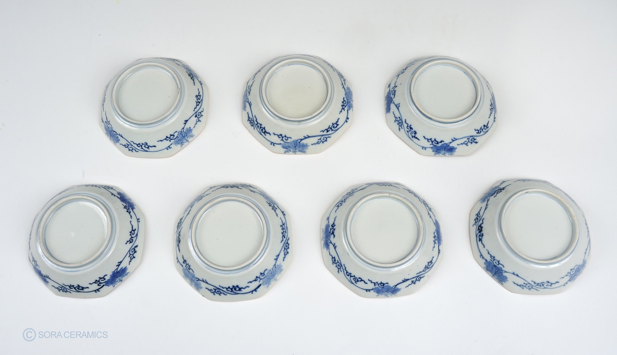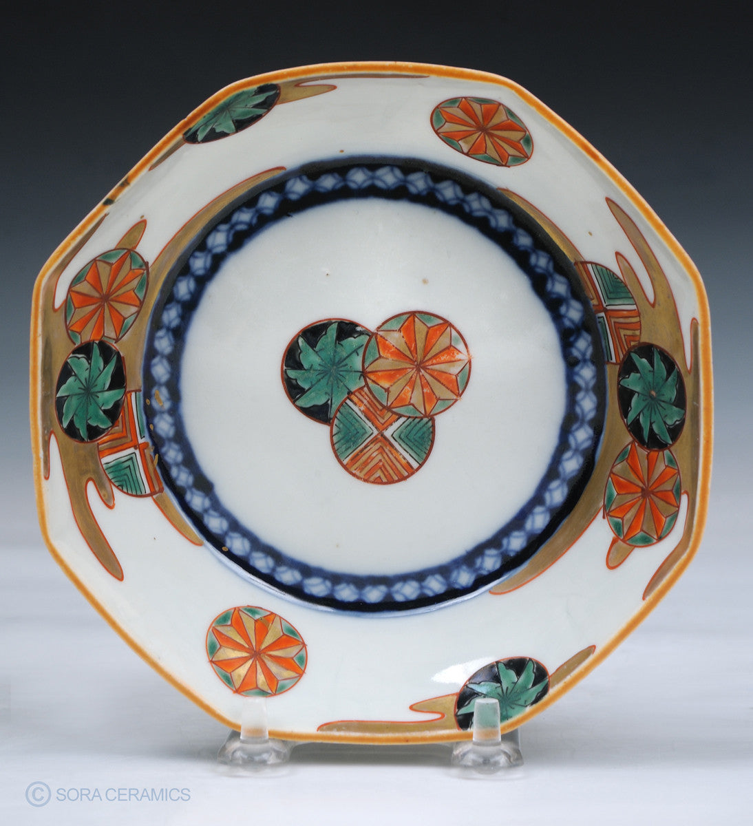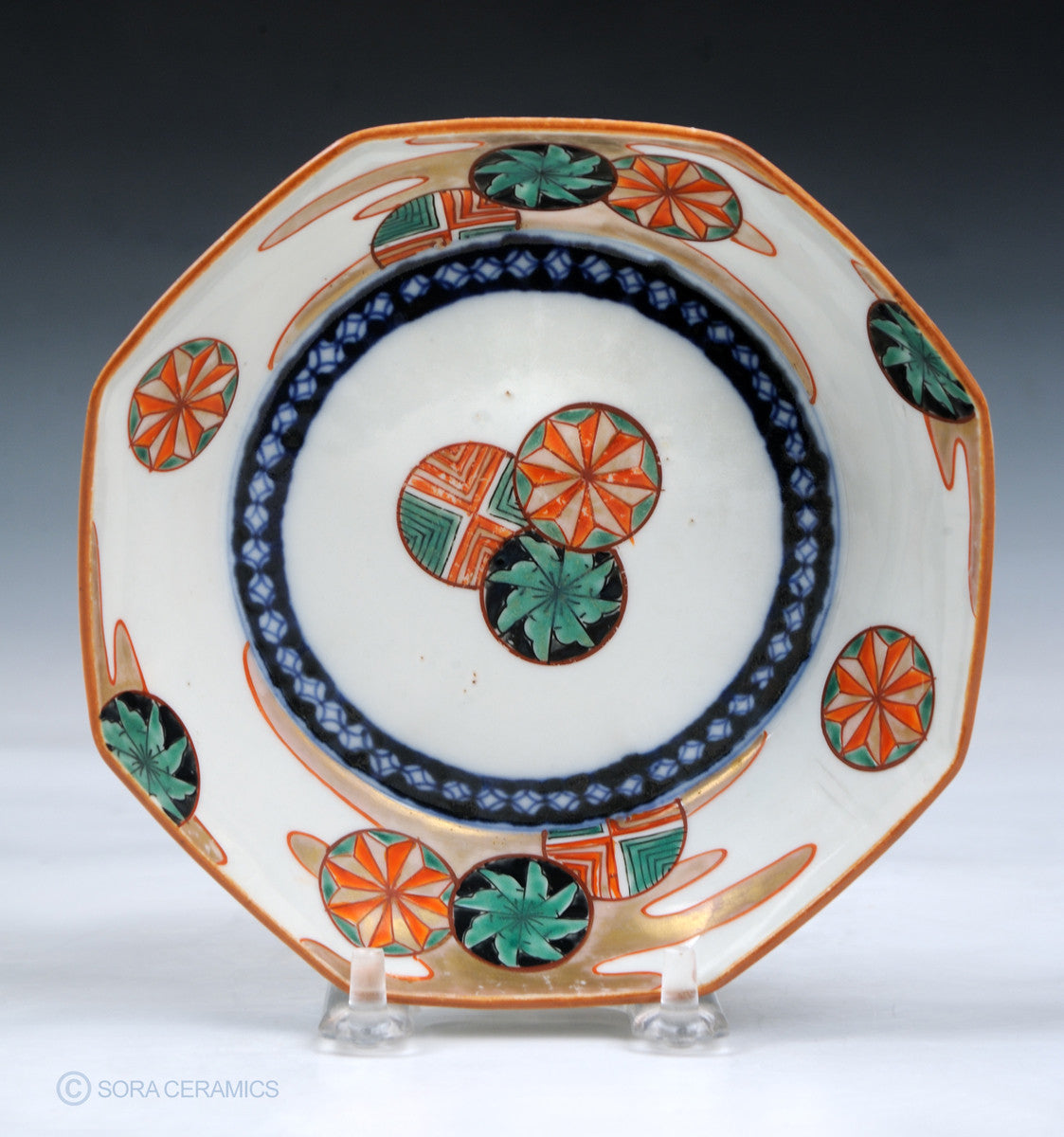 Set of 7 aka-e Imari hexagonal small dishes with underglazed blue border at base of interior white space encircling three coin-shaped geometric designs in right gold and autumn tones, repeated along the rim. Clusters of leaves and a karakusa vine encircle the exterior. 5-7/8″ (5.875 cm) diameter, 1-3/4″ (4.37 cm) high on a triple-ringed plain base 3-1/4″ (8.125 cm) diameter plain base. Priced individually@ $90 or set of 7 @ $575.